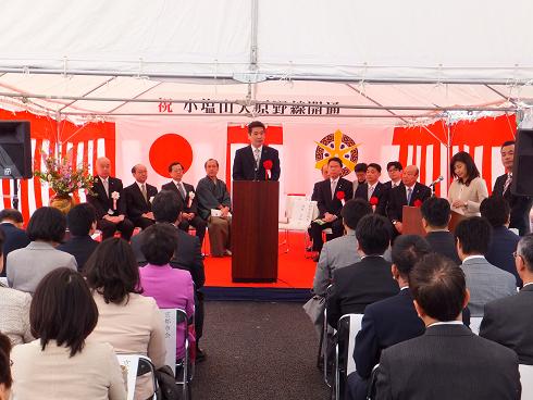 小塩山大原野線開通式典が開催され,議長,副議長ともに出席しました。議長は,「この小塩山大原野線の開通により,洛西地域の交通環境が大きく向上するとともに,新たな地域の活力が生まれ,京都市全体のまちづくりの更なる発展につながっていきますことを心からご期待申し上げます。」と祝辞を述べました。