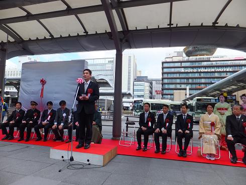 市バス新運転計画スタート・京都駅前バスのりばリニューアル記念式典(京都駅前バス乗り場)(橋村議長,隠塚副議長出席)