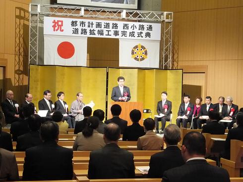 都市計画道路 西小路通道路拡幅工事完成式典が開催され,議長,副議長ともに出席しました。議長は,「道路の拡幅とともに,対面通行,歩道の新設が実現し,新しく生まれ変わった西小路通が,地元の皆様方の日々の暮らしに欠かせない快適な生活道路として,さらには,京都市全体の活力を支える幹線道路として,大きな役割を果たしていきますことをご期待申し上げます。」と祝辞を述べました。