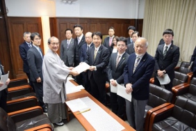 平成28年熊本地震に対して,被災地域の一日も早い復旧と復興を支援するため,京都市会議員全員による義援金を,京都市会議長から熊本市議会議長に贈呈するとともに,見舞状を送付しました。