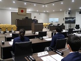 本日,京都御池中学校,中京中学校,下京中学校,九条中学校,開睛小中学校,春日丘中学校の皆さんが,市会議場の見学に来られ,市会の仕組みや役割,議場について学んでいただきました。市会を代表して山本恵一議長からは,市会の取組や重要性についてお話しいただきました。