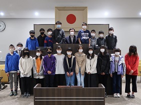12月11日に,市立安朱小学校の5年生28名の皆さんが,市会議場の見学に来られ,市会の仕組みや役割,議場について学んでいただきました。市会を代表して山本恵一議長からは,市会の取組や重要性についてお話していただきました。