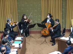 令和5年2月市会が2月16日(木)から始まりました。3月22日(水)まで開催します。詳しい日程はこちらからご覧ください。本会議に先立ち、京都市交響楽団による、「京都市歌」とモーツァルト作曲のセレナード第13番「アイネ・クライネ・ナハトムジーク」より第1楽章の演奏がありました。