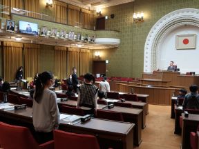 12月26日に、二条中学校、西ノ京中学校、山科中学校、凌風小中学校、松尾中学校、藤森中学校の生徒の皆さんが、市会議場の見学に来られました。見学会では、京都市会を代表して田中議長から市会の重要性などについてお話しいただき、生徒は実際の議席に座って市会の仕組みや役割を学びました。その後、議場の内部の見学や予算議案の表決の場面を想定した模擬本会議を実施しました。
