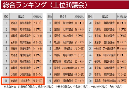 令和5年3月22日に、早稲田大学マニフェスト研究所から「議会改革度調査2022」が発表され、京都市会が、全地方公共団体の議会 1,788議会中(回答1,416議会)、政令市でトップとなる全国第10位にランクインしました。本市会は、昨年度も23位と上位に位置しており、本市会が様々な取組を地道に実施してきたことの積み重ねが反映されたものです。