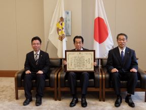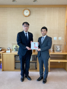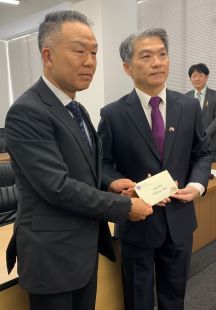 令和6年能登半島地震の被災地である石川県に対して、災害見舞金を市会議長及び市長連名で贈呈しました。2月14日に、本市東京事務所長(右)から、石川県東京事務所長(左)に対して目録の贈呈を行いました。広報資料は、こちらをご覧ください。