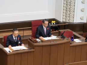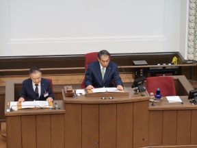 本日の本会議で、新市会発足に伴う議長及び副議長の選挙が行われ、自由民主党京都市会議員団の西村義直議員が第86代議長に、公明党京都市会議員団の平山よしかず議員が第96代副議長に選出されました。就任あいさつにおいて、西村議長は「市民の安心安全、更なる社会福祉の向上や地域の活性化を目指し、議会の役割を通してその職責を果たしてまいる。」、また平山副議長は、「西村議長の良き補佐役として、誠実かつ情熱をもって、円滑な議会の運営に取り組んでまいりたい。」と述べました。
