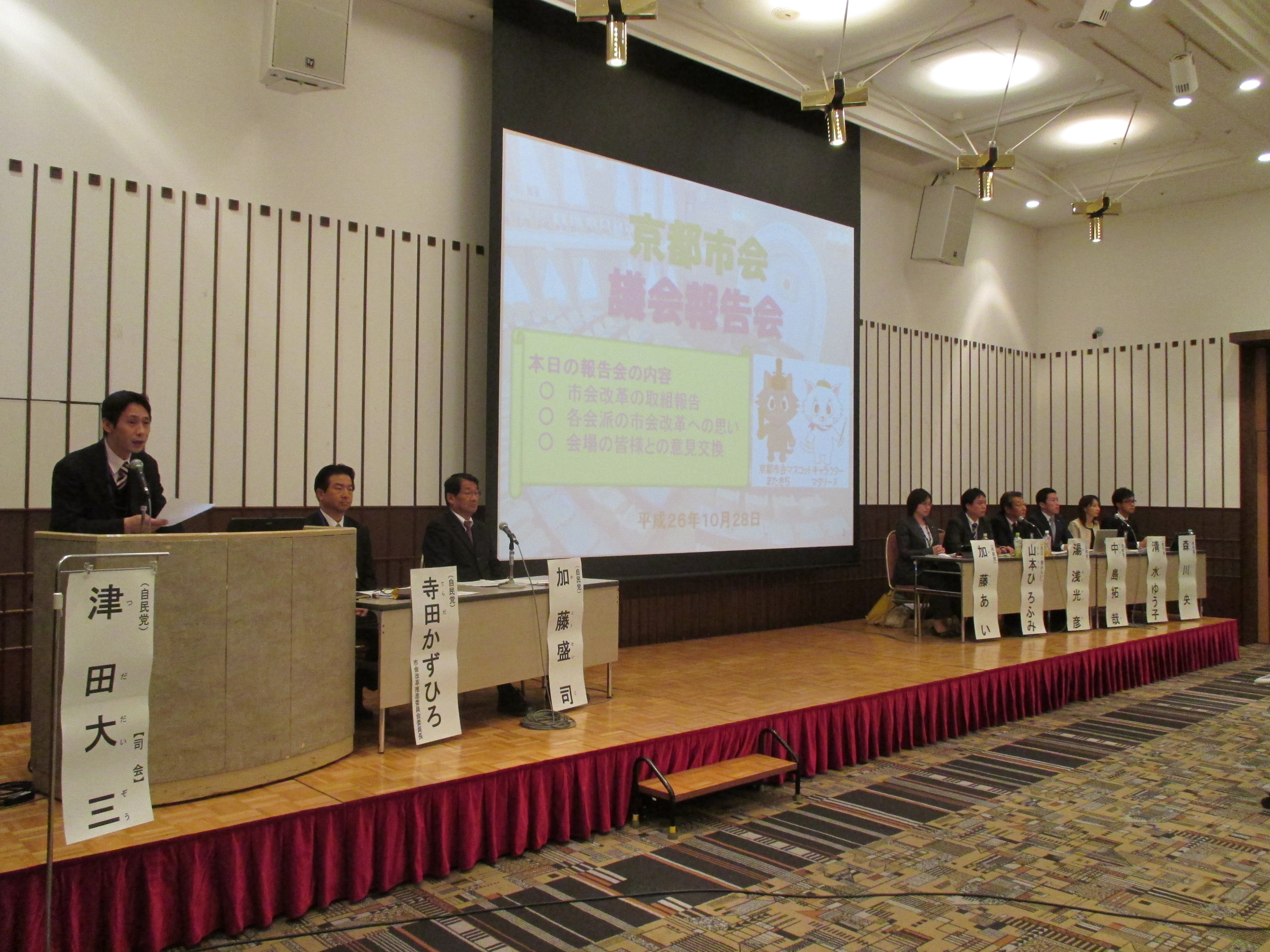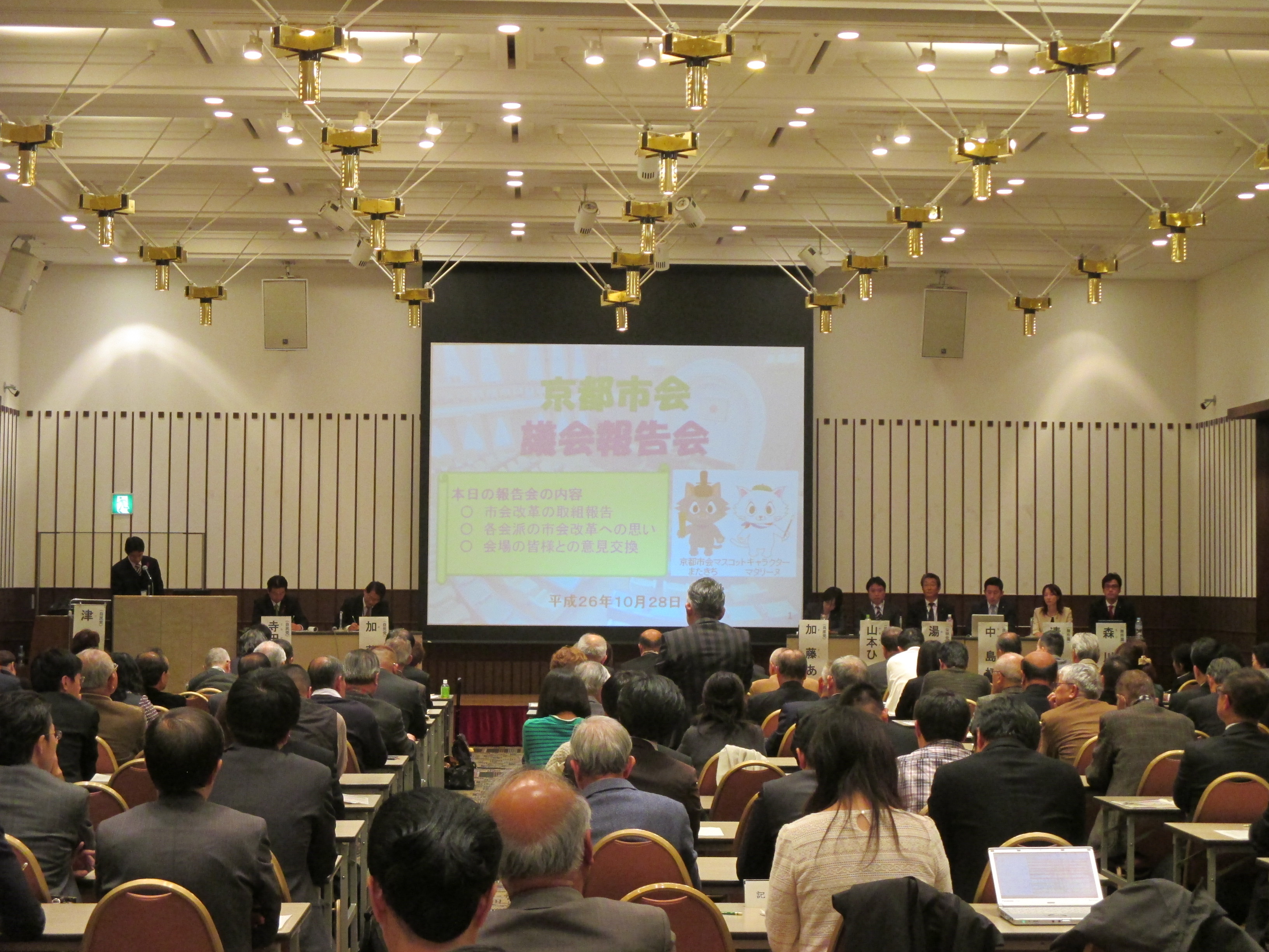 10月28日に,京都市会初となる議会報告会をメルパルク京都で開催し,市政協力委員の方々をはじめ,141名の方に御来場いただきました。当日は,京都市会基本条例の制定や通年議会の導入など,京都市会がこれまで進めてきた市会改革の取組について報告し,各会派が市会改革への思いを述べた後,会場の皆様との意見交換を行いました。