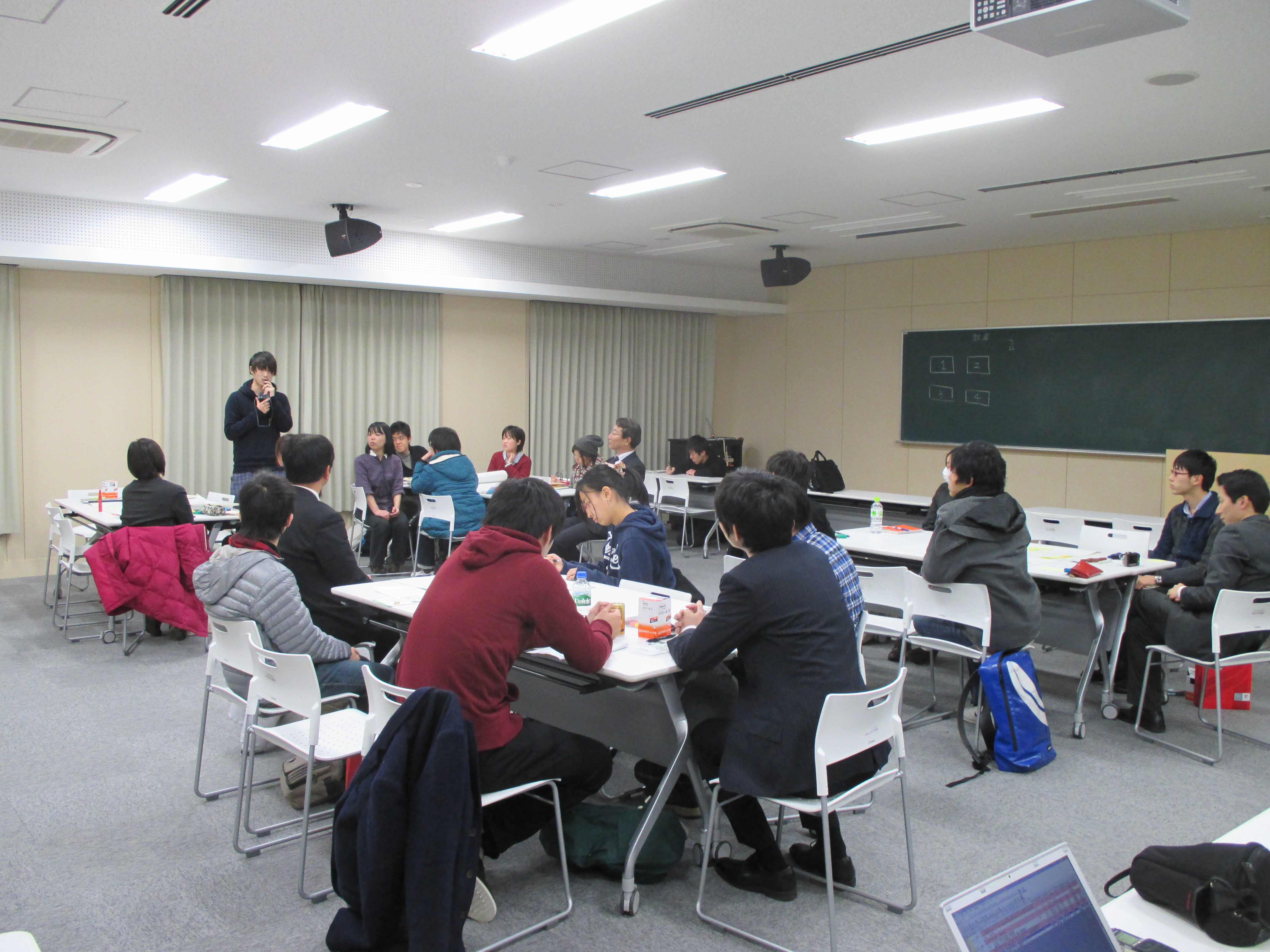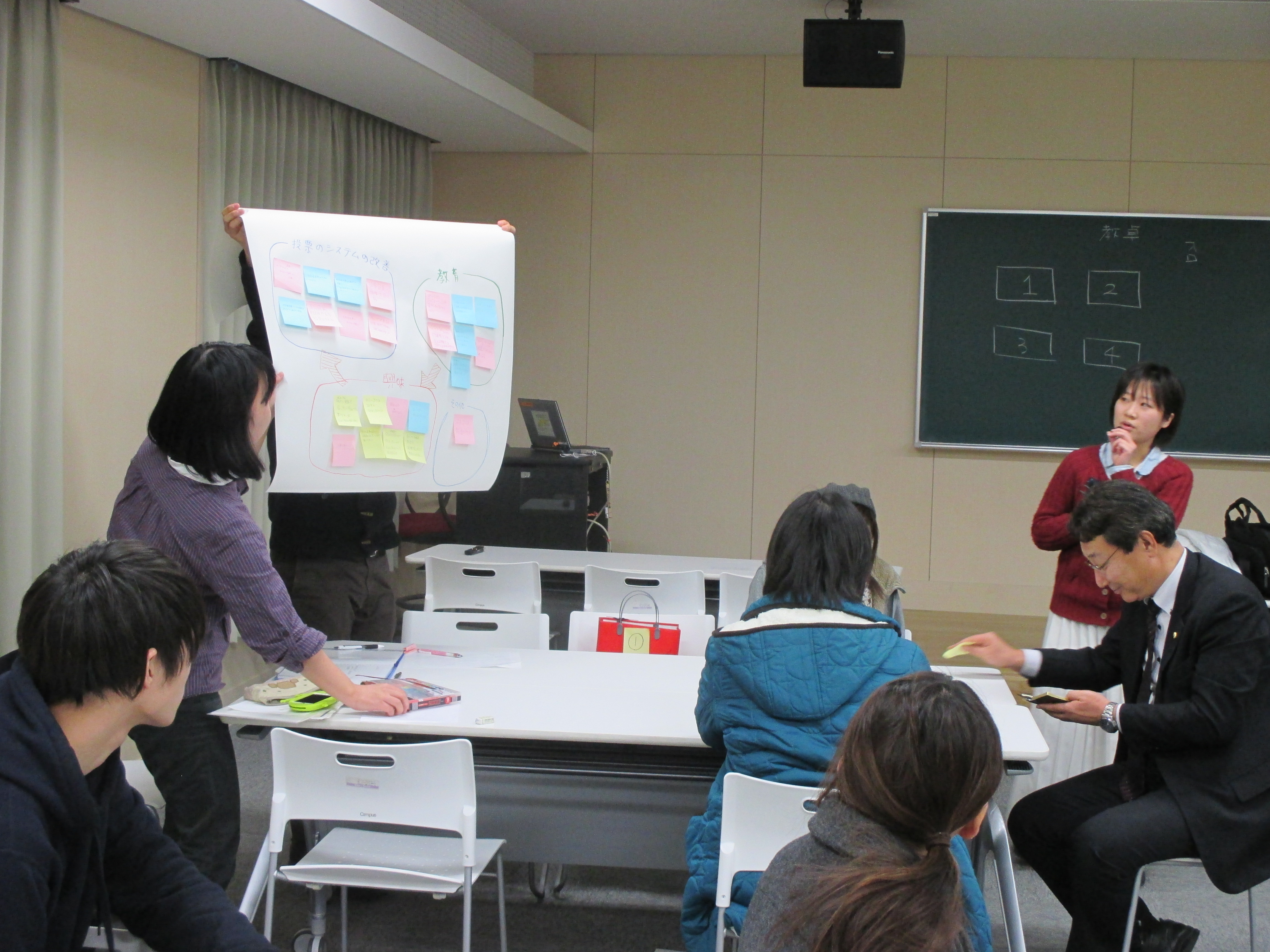 当日は,学生の皆様から学内で実施された選挙等に関するアンケートの結果について発表いただいた後,「若者の投票率を上げるには?」と題して,学生の皆様と議員によるワークショップを開催し,グループごとに意見を発表しました。