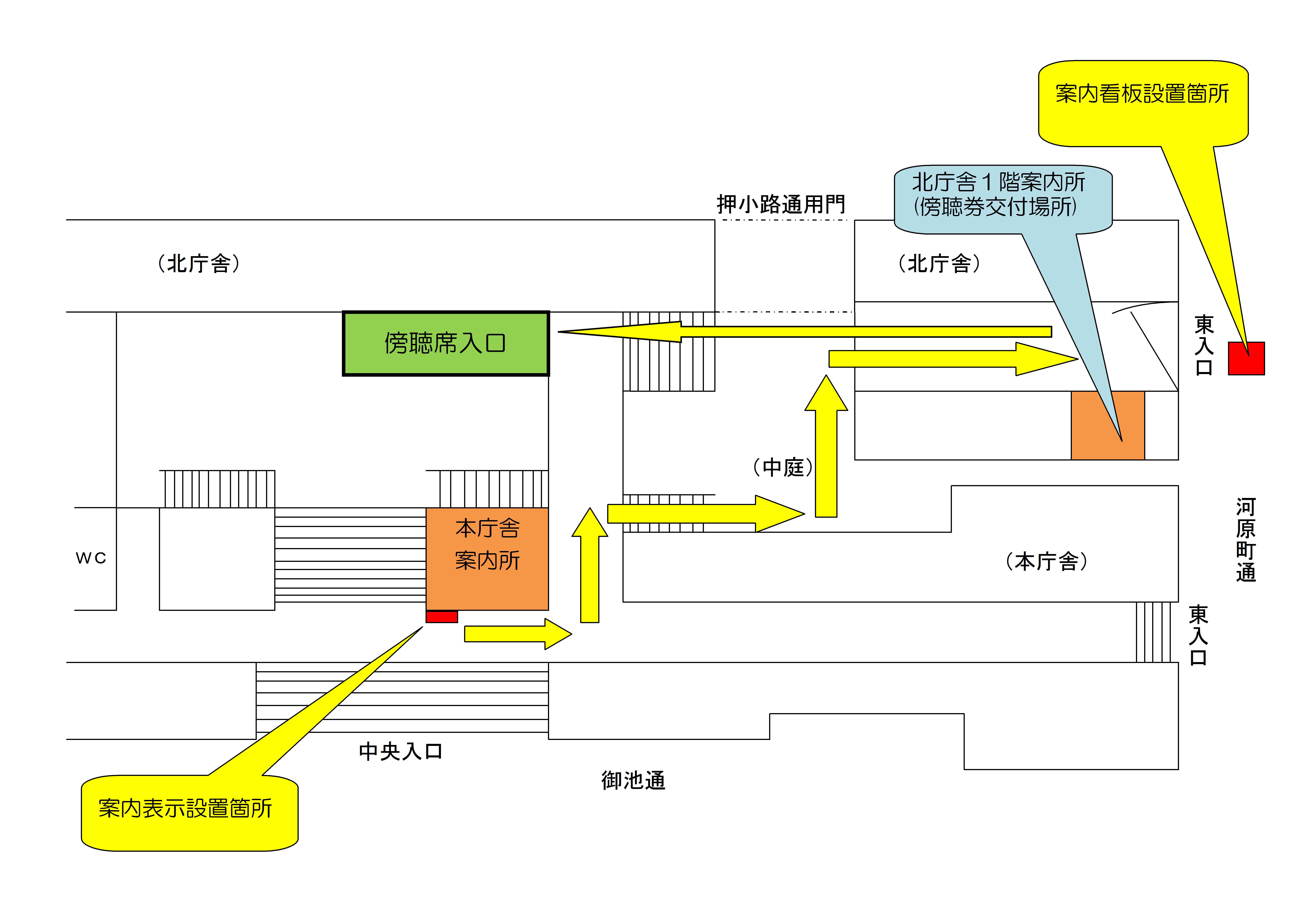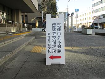 本会議の傍聴券交付場所(市役所北庁舎1階案内所)を分かりやすくお伝えするため,本会議開会日に,市役所北庁舎東側入口前(河原町通側)に案内看板を,市役所本庁舎正面玄関に案内表示を設置します。 傍聴券交付場所はこちらを御覧ください。