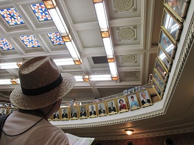 議席に座り,議場の雰囲気を体感しながら,市会の仕組みや役割,議場についての説明を聞かれるとともに,傍聴席からの議場の様子も見学されました。