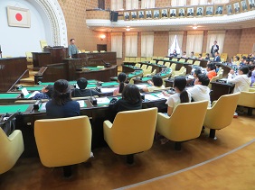 寺田議長からは,市会の意義・重要性についてお話しました。皆さんは,議長の話をしっかりとメモを取りながら聞き,その後の質疑応答の際には,会議や議場のことなど多くの質問をされていました。