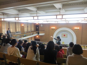 議席に座り,議場の雰囲気を体感しながら,市会の仕組みや役割,議場についての説明を聞かれるとともに,傍聴席にも実際に座ってみるなど,色々な視点から議場を御覧いただきました。