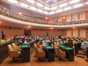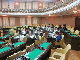 議席に座り,議場の雰囲気を体感しながら,市会の仕組みや役割,議場についての説明を聞かれました。はじめは皆さん緊張されているようでしたが,熱心にお話を聞かれ,最後の質疑の時間にはたくさんの質問を頂きました。