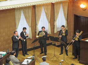 2月市会が2月19日火曜日から始まりました。本会議の開催に先立ち,京都市交響楽団による演奏が市会議場で行われ,「京都市歌」とジャイルズ ファーナビーの「空想 おもちゃ 夢」から第1,3,6楽章を演奏いただきました。