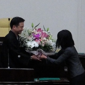市会事務局長が事務局を代表して御礼の言葉を述べ,事務局職員から花束を贈呈した後,寺田議長,湯浅副議長から退任にあたっての挨拶がありました。