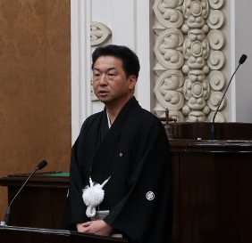 京都市会議員として40年もの長きにわたり,市政の発展と福祉の向上に御尽力された井上与一郎前議員に対し,本会議の議決により永年在職議員(40年)の表彰を行いました。