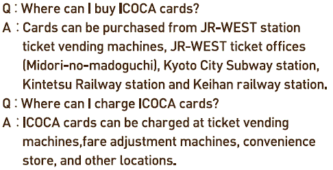 West Japan Railway (How to use JR-West) Hankyu Railway (How to get on a train) Keihan Railway (Fares) Kintetsu Railway (Before boarding a train) Sagano Romantic Train (FAQ)